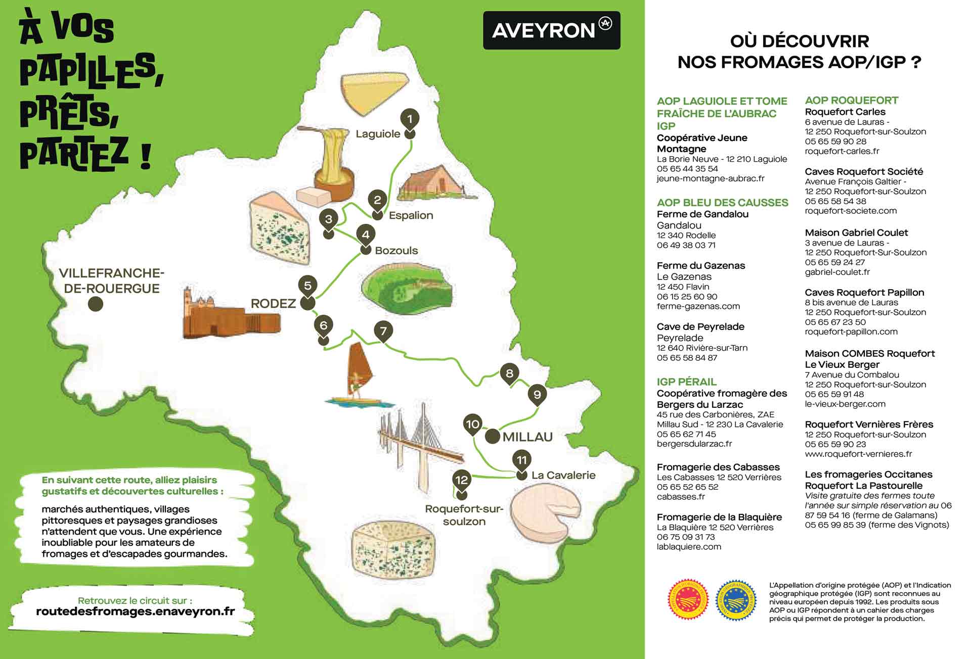 De Laguiole à Roquefort, en passant par Espalion, Bozouls, Rodez, Millau et La Cavalerie, 12 points de chute jalonnent cette Route des fromages… «dans le sens que l’on veut et dans le temps que l’on veut» ! invitent les initiateurs du projet. Et si l’officialisation de cette carte a été différée de quelques mois, c’était pour laisser toute la place au centenaire du Roquefort et à la reconnaissance du Pérail par l’IGP… Désormais la route est ouverte !